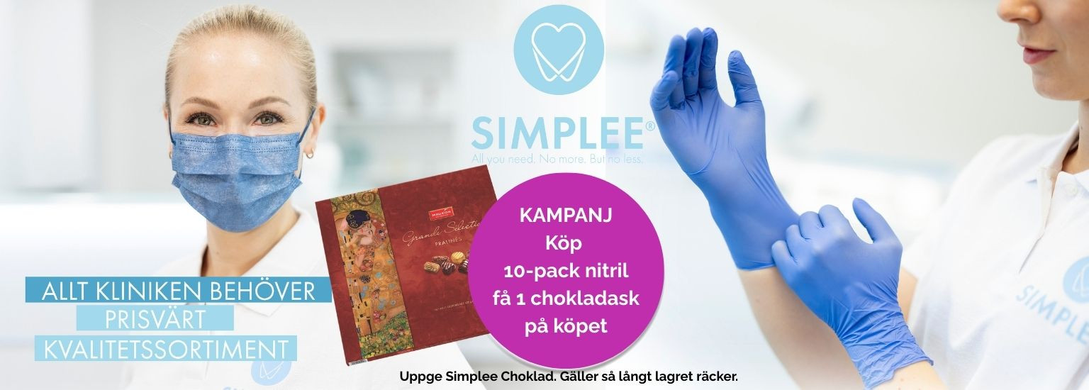 Köp 10 förpackningar Simplee Nitril - av samma storlek och samma färg. Chokladaskarna finns i begränsat antal, först till kvarn gäller. Uppge SimpleeChoklad för att aktivera kampanjen.