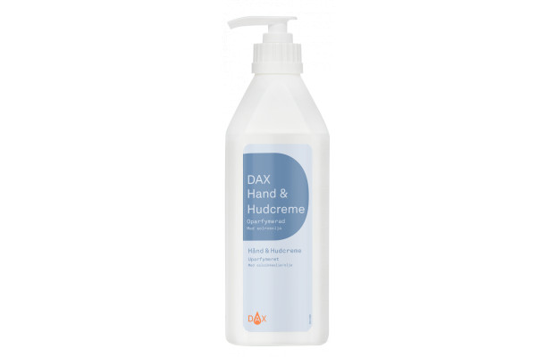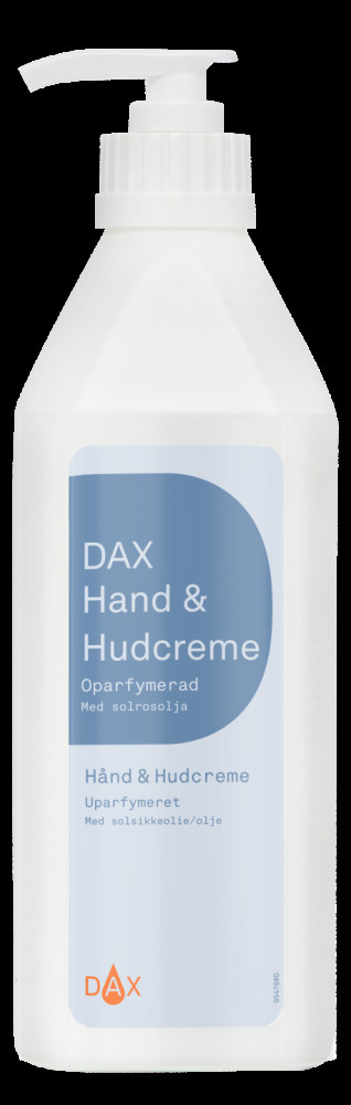 DAX Hand & Hudcreme återställer och bevarar hudens fukt- och fettbalans. Cremen gör snabbt torr och narig hud naturligt mjuk och smidig. Den passar utmärkt för daglig hudvård av såväl händer som hela kroppen och den går snabbt in i huden och återfuktar utan att kännas kladdig. Oparfymerad. Innehåller solrosolja med hudvårdande egenskaper. Fetthalt ca 17%. pH-värde 5. Innehåll: 600ml i pumpflaska
