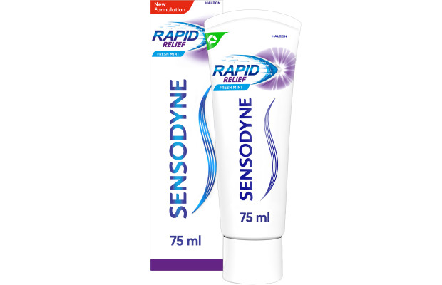 Sensodyne Rapid Relief tandkräm är kliniskt bevisad att snabbt lindra ilningar i tänderna. Den unika formulan i Sensodyne Rapid Relief tandkräm skapar snabbt ett skyddande lager över tändernas känsliga områden. Sensodyne Rapid Relief tandkräm ger snabb lindring och bygger kontinuerligt skydd vid varje borstning. Sensodyne Rapid Relief tandkräm innehåller fluor som hjälper till att stärka tänderna och skydda mot karies. Använd Sensodyne Rapid Relief som en daglig tandkräm: * För kliniskt bevisad lindring av ilningar på bara 60 sekunder. *Tar bort plack vid använding två gånger dagligen och innehåller fluor som skyddar mot karies. Fluorhalt: 1450ppm tennfluorid & NaFI Innehåll: 12x75ml