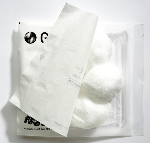Sterila rundtork i gasväv som består av 100% bomull. Naturlatexfria. Storlek: 40 mm i diameter Förpackning: 18 kuvert á 5 st Innehåll: totalt 150 rundtork