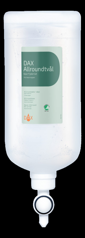 DAX Allroundtvål är en extra mild och krämig tvål som passar för såväl kroppstvätt som hårtvätt. Innehåll: 1 x 1liter Rengör huden varsamt utan att torka ut och lämnar en fräsch känsla. Skonsam mot huden, även vid frekvent användning. Oparfymerad. Miljömärkt med Svanen. pH ca 5 Innehåll: 1000ml i dispensopack