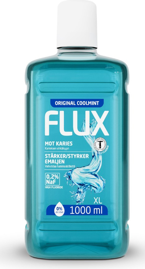 Flux Mild har samma unika egenskaper som vanliga Flux 0,2% NaF. Den har en mildare smak av coolmint och har en transparent vätska. Den innehåller den högsta fluorhalt som finns bland allasköljvätskor. Regelbunden användning av Flux stärker tandytan och förebygger karies. För bästa effekt bör man skölja med 10ml Flux 1-2 gånger om dagen. Flux 0,2% Natriumfluorid rekommenderas till vuxna och barn över 12 år. Innehåll: 6x1000ml