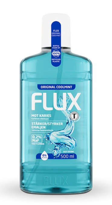 Fluorsköljvätska innehållande 0,2% natriumfluorid. Smak av cool mint, 5% mintolja. Stärker emaljen, förebygger karies samt ger en fräsch andedräkt. För bästa effekt bör man skölja med 10 ml Flux 1-2 gånger om dagen. Flux 0,2% rekommenderas till barn över 12 år. Innehåll: 12x500ml
