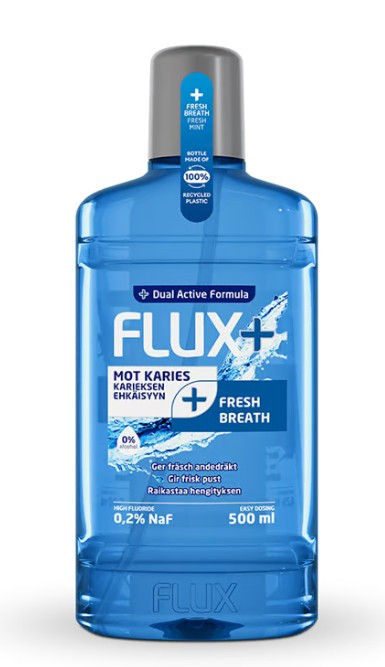Flux Fresh har dubbel verkan: den säkerställer god andedräkt och verkar kariesförebyggande genom att stärka tandemaljen. Befintliga kariesangrepp kan utvecklas långsammare eller stanna upp helt. Flux Fresh har samma höga fluorhalt som vanliga Flux (0,2 % NaF) och innehåller även zinklactat och en låg dos klorhexidin för att neutralisera ämnen som orsakar dålig lukt. Rekommendationen är att skölja med 10 ml 1-2 ggr per dag som ett komplement till tandborstning med fluortandkräm. Innehåller ingen ALKOHOL. Smak: Fresh mint Innehåll: 12x500ml