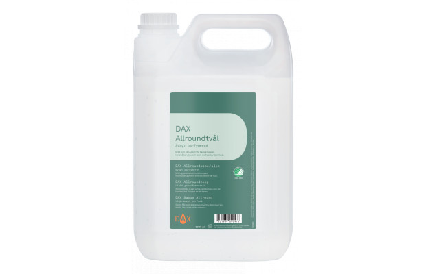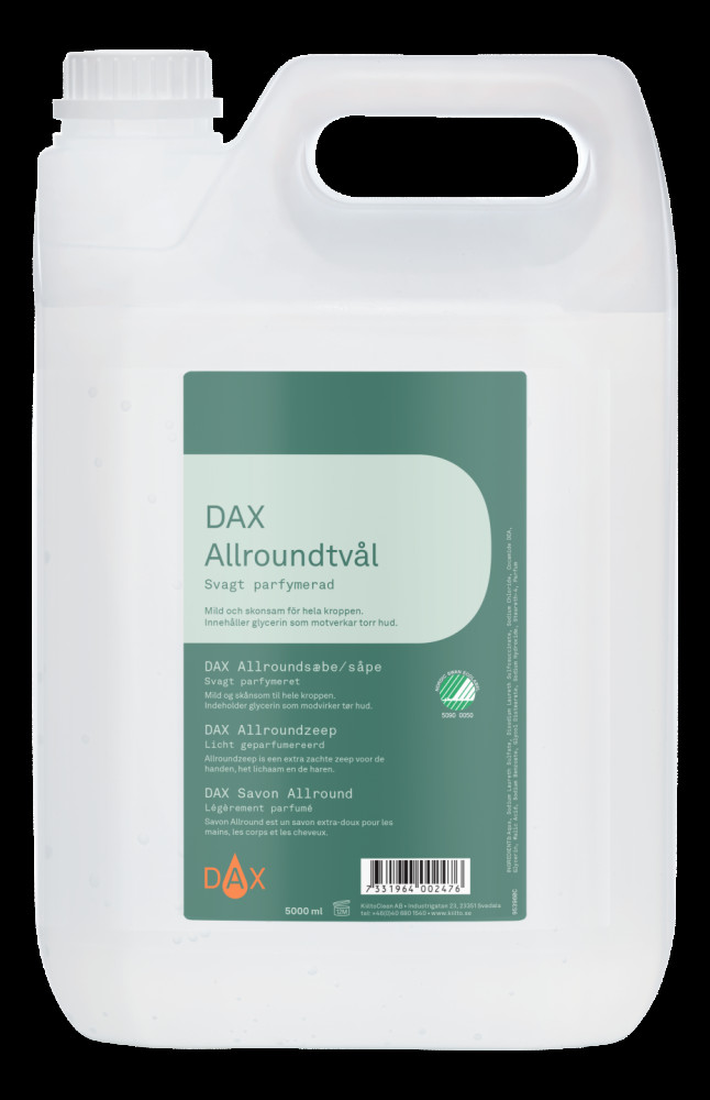 DAX Allroundtvål är en extra mild och krämig tvål som passar för såväl kroppstvätt som hårtvätt. Rengör huden varsamt utan att torka ut och lämnar en fräsch känsla. Skonsam mot huden, även vid frekvent användning. Parfymerad. Miljömärkt med Svanen. pH ca 5 Innehåll: 5 liter i dunk