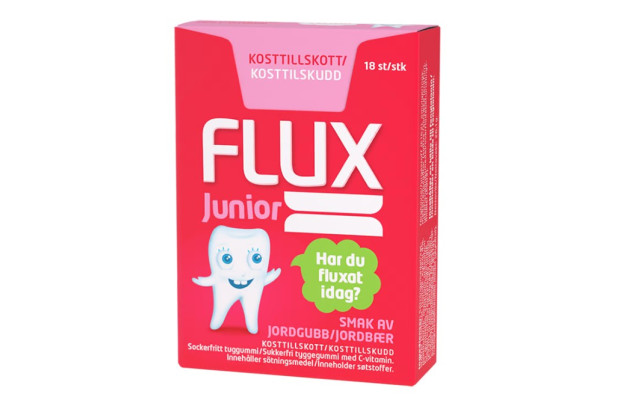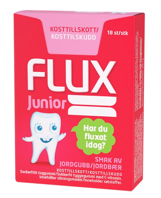 Ett sockerfritt tuggummi med jordgubbssmak. Innehåller bland annat xylitol, kalcium och viktig C-vitamin. Speciellt utvecklat för barn 6-12 år. Flux Junior Tuggummi främjar salivproduktionen och skyddar tänderna mot syraattacker som angriper emaljen efter att man har ätit och druckit. Flux Junior Tuggummi är ett bra komplement till barnens dagliga tandvård. Produkten innehåller bland annat xylitol och c-vitamin. En ask innehåller 18 bitar. Innehåll: 20x18st
