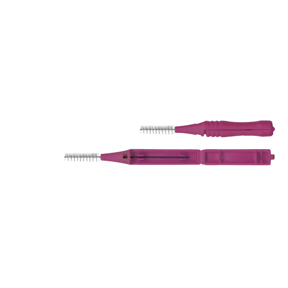 Interdentalborste, för approximal rengöring. Plastöverdragen metalltråd med borst av Du Pont nylon. Handtag och hylsa av polypropen. Innehåll: 1st handtag med hylsa och 12st utbytbara borstar,