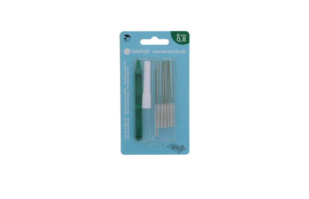 Interdentalborste, för approximal rengöring. Plastöverdragen metalltråd med borst av Du Pont nylon. Handtag och hylsa av polypropen. Innehåll: 1st handtag med hylsa och 12st utbytbara borstar,