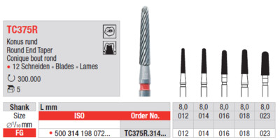 Finirborr i hårdmetall. För kronpreparation och preparering av kaviteter. Passar även för trimning av titandistanser. Färgmarkering: röd. 12-blad. Fattning: FG Innehåll: 5st