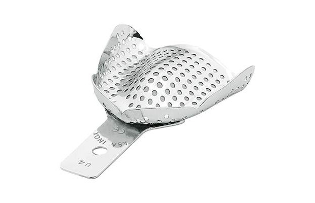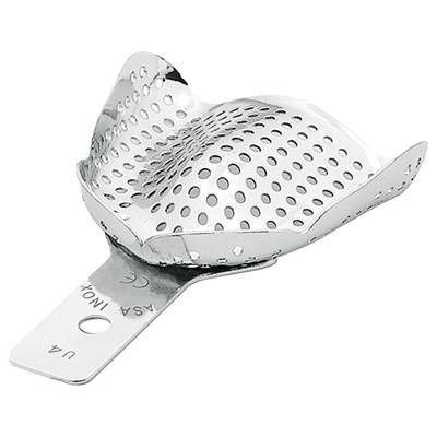 Avtryckssked i rostfritt stål för tandlös överkäke , perforerad. Storlek M, 70x60 mm Innehåll: 1st