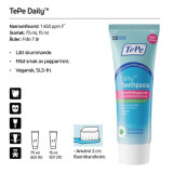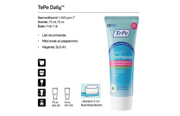 TePe Daily Toothpaste är en skonsam lätt skummande tandkräm med fluorid som hjälper till att motverka karies. Tandkrämen har en mild pepparmintsmak. Ett svenskt recept med endast ett fåtal noga utvalda ingredienser. Tandkrämen innehåller inga mikroplaster och är fri från SLS, ett skummedel som kan irritera känsliga slemhinnor. Innehåller 1450 ppm fluorid. Lämplig för veganer. Innehåll: 100x15ml Märkning: Bra miljöval