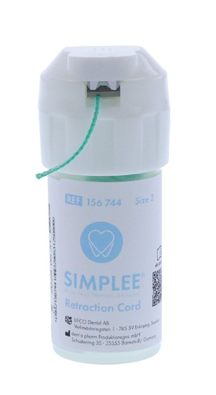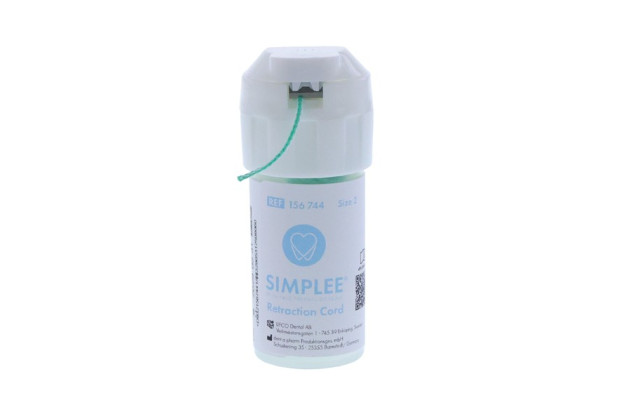 Retraktionstråd flätad av ett stort antal små öglor som bildar en sammankopplad kedja. Den speciella designen resulterar i ett enhetligt fast tryck i tandköttsfickan. På grund av sin speciella vävning säkerställer Simplee retraktionstråd utmärkt vävnadsretraktion och håller sig bättre fast i tandköttsfickan än konventionella retraktionstrådar. Simplee retraktionstråd har också en blodstillande effekt eftersom den kan ta upp en betydligt större mängd blod än konventionella trådar. Praktiskt skärblad i locket. Oimpregnerad. Gjord av 100% bomull. Innehåll: 275cm