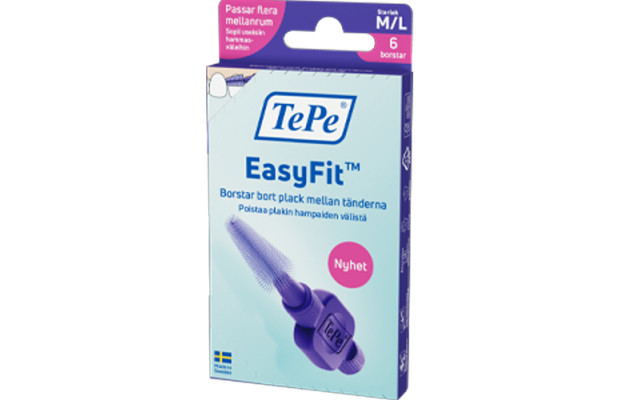 TePe EasyFit mellanrumsborste har en konisk form för att passa många mellanrum. Den har ett stabilt och ergonomiskt skaft, samt en lång borstlängd med plastöverdragen metalltråd. Skyddshylsan kan även användas som skaftförlängare. För att se tydlig skillnad från TePe's mellanrumsborstar original så är borststråna färgade. Finns i två storlekar - S/M och M/L. Borstskaftet och hylsan är tillverkade av förnybara material enligt massbalansmetoden. 100% av förpackningen består av förnybart och/eller FSC-certifierat material. Innehåll: 10x6st