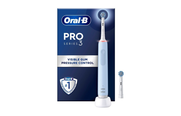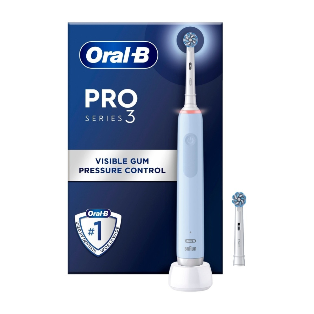 Oral-B PRO 3 med 3D-teknik, 3 borstlägen och 2-minuterstimer. 360° tryckreglering. Långvarigt batteri och laddningsindikator. Innehåll: 1st handtag, laddningsställ och 2st Sensitive Clean & Care borsthuvuden