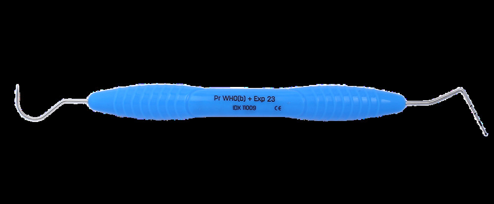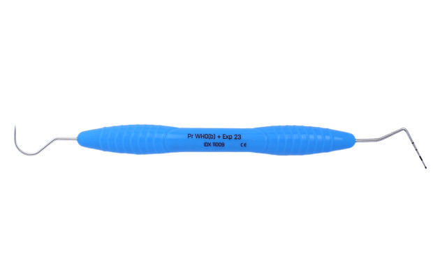 Dubbeländad böjd undersökningssond och WHO CP fickmätningssond med kula av rostfritt stål och gradering 3mm. Ergonomiskt silikonhandtag, Ø 13,5mm. Innehåll: 1st