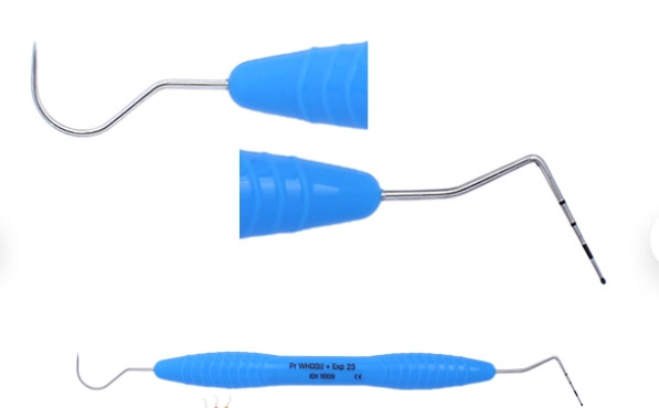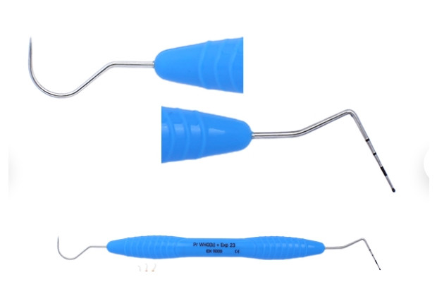 Dubbeländad böjd undersökningssond och WHO fickmätningssond av rostfritt stål. Ergonomiskt silikonhandtag, Ø 11,5mm. Innehåll: 1st