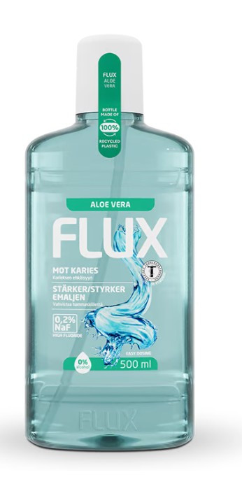 Fluorsköljvätska som stärker tandytan och ger starka tänder. Regelbunden användning av Flux förebygger karies. För bästa effekt bör man skölja med 10 ml 1-2 gånger om dagen, som ett komplement till tandborstning. Innehåller Aloe Vera. Innehåll: 1 x 500ml