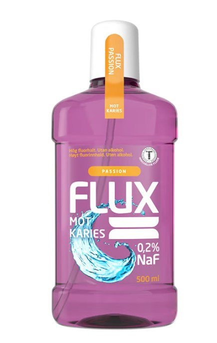 Flux Passion är en fluorsköljvätska som stärker tandytan och ger starka tänder. Produkten är utan alkohol och färgämne (infärgad flaska). Förpackningen har en praktisk doseringspump som ger en perfekt dosering varje gång. Fluorinnehåll: 0,2% NaF Smak: Fruktig smak av passionsfrukt Rekommenderas till: Vuxna och barn över 12 år Innehåll: 1x500ml