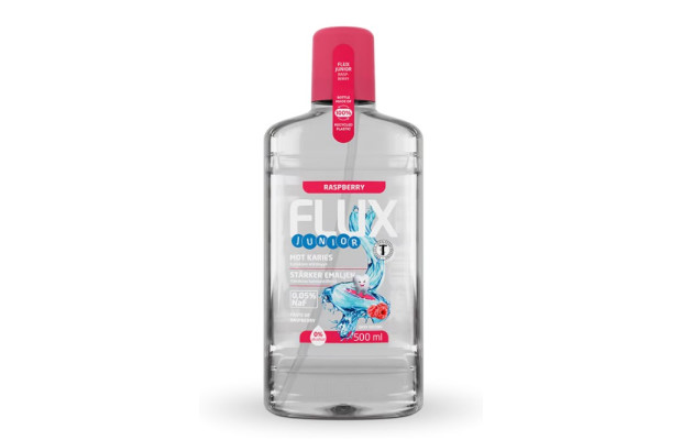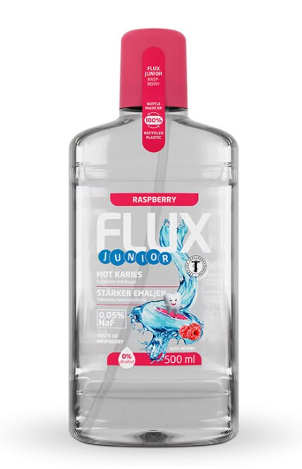 Fluorsköljvätska för barn som har en mild smak av hallon. Innehåller 0,05% natriumfluorid. Förebygger karies samt ger en fräsch andedräkt. För bästa effekt bör man skölja med 10 ml Flux 1-2 gånger om dagen. Flux junior rekommenderas för barn mellan 6-12 år. Innehåll: 1x500ml