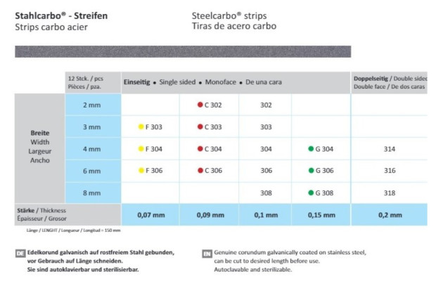 Horico stålstrips, slipmedel på en sida, 15cm. Grovlek: Extra fin Tjocklek: 0,07mm Bredd: 3mm Innehåll: 12st