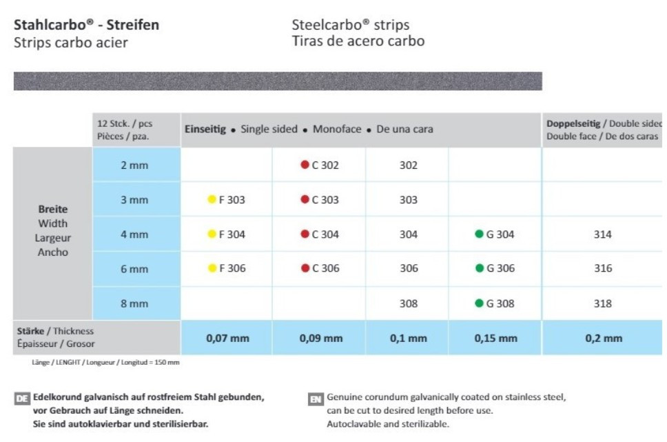 Horico stålstrips, slipmedel på ena sidan, 15cm. Grovlek: Medium Tjocklek: 0,1mm Bredd: 8mm Innehåll: 12st